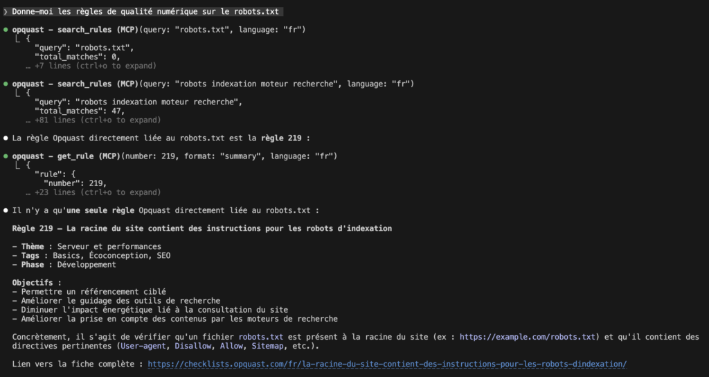 Nous avons développé un serveur MCP Opquast qui rend les 245 règles du référentiel Qualité numérique directement accessibles aux assistants IA. Concrètement, cela signifie qu’un assistant peut désormais :